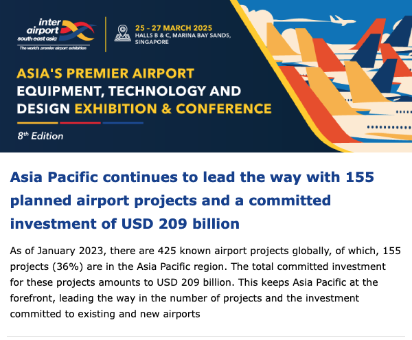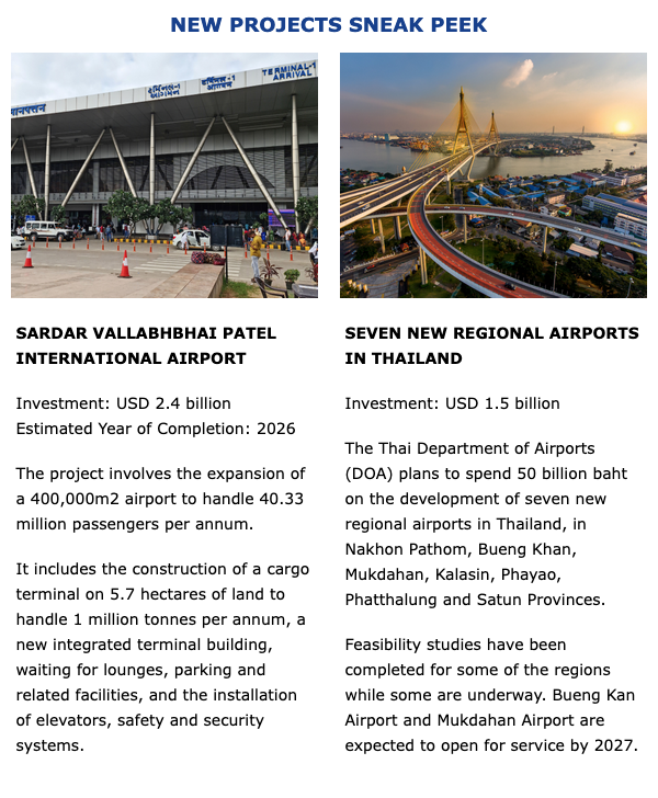 Asia Pacific continues to lead the way with 155 planned airport projects and a committed investment of USD 209 billion. As of January 2023, there are 425 known airport projects globally, of which, 155 projects (36%) are in the Asia Pacific region.