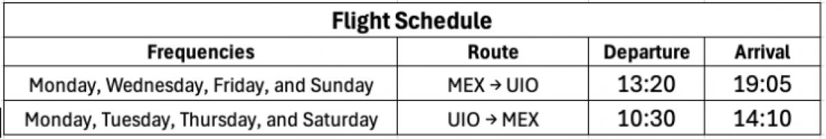“At Aeromexico we continue working to expand our connectivity network to the key destinations around the world, and in this sense, we are excited to land again in Quito, thus reactivating the air bridge with Ecuador. With this service, Aeroméxico now has eight permanent routes and one seasonal route in South America, providing passengers in the region with an efficient connectivity option to more than 40 destinations in Mexico, 25 in the United States, 3 in Canada, 6 in Europe, and 2 in Asia” .