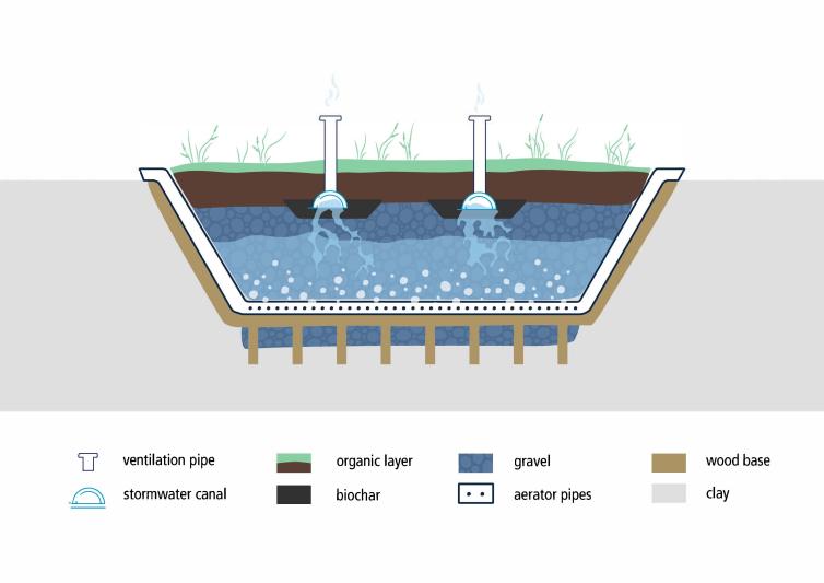 The underground wetland is a basin filled with gravel and sealed at the bottom, where the storm water that drains onto its surface is cleaned when it passes through the gravel layer. The cleaning is enhanced by the compressed air supplied from the bottom of the basin through the aeration system.