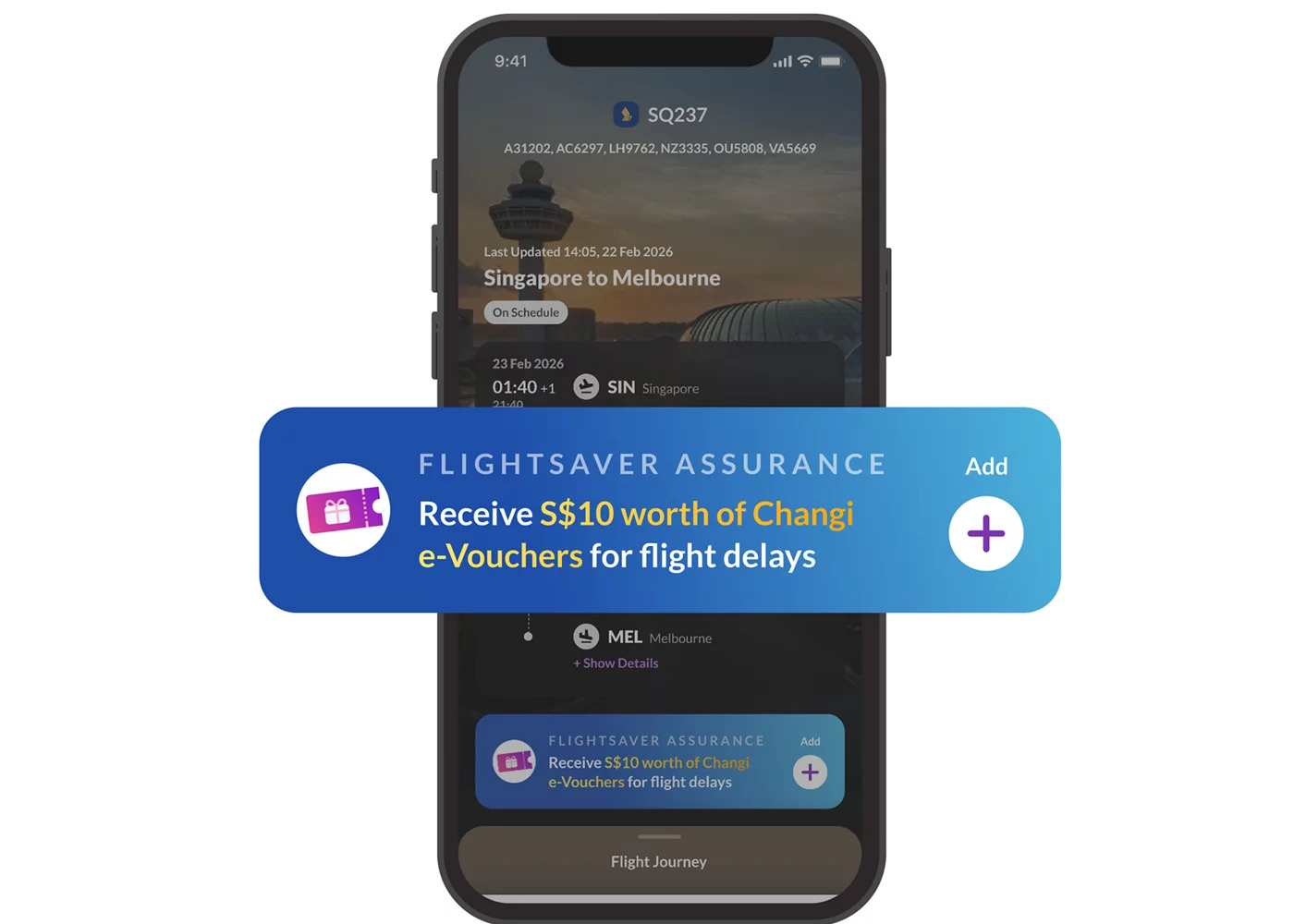 Travellers who opt-in for FlightSaver Assurance at least 12 hours before their scheduled departure will enjoy S$10 Changi e-vouchers if their scheduled time of departure from Singapore is extended by three hours or more (terms and conditions apply). This is credited instantly to their app account and stays valid for 30 days. E-vouchers can be used immediately at participating outlets in the transit areas of Changi Airport. This benefit, which can be enjoyed once per calendar month, is part of a trial programme running till 30 September 2026. The programme will be progressively refined with the goal of becoming a long-term offering for travellers.