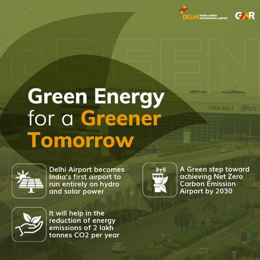 Delhi Airport is India’s first airport to run entirely on hydro and solar power in what is a major milestone towards becoming a Net Zero Carbon Emission Airport by 2030.
