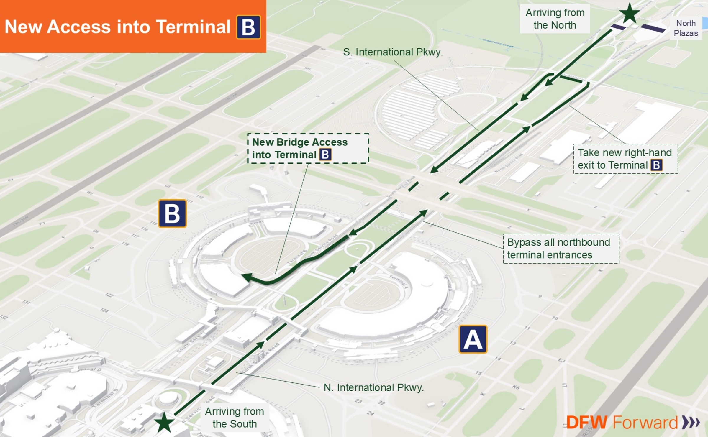 Dallas Fort Worth International Airport (DFW) today opened the final configuration of the new access into Terminal B, which includes new right-hand exits from International Parkway, a new bridge into the terminal and all associated roadway infrastructure to support the improved access. This marks the completion of the first of three final 90-day construction phases to complete the new bridges and right-hand access into Terminal A, B and C as part of the International Parkway Project.