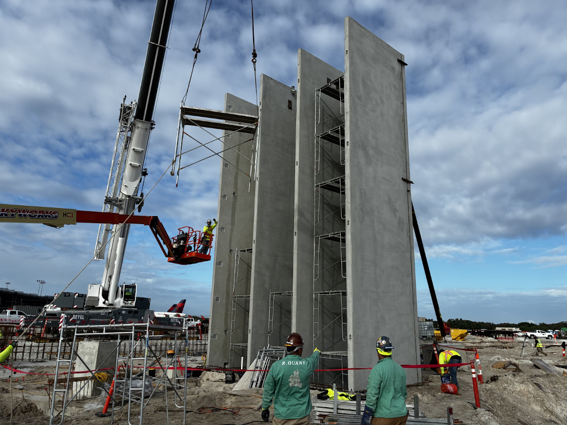 The first vertical elements of Tampa International Airport’s future Airside D are beginning to appear this month as work crews have been assembling the building’s concrete elevator cores.