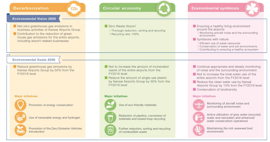We, Kansai Airports Group, have been actively working on reducing our environmental impact at the 3 airports we operate. We formulated the Environmental Vision 2050 and Environmental Goals 2030 to recognize once again the importance of solving environmental issues on a global scale, such as by decarbonization, and to not only continue the existing plans but also further advance them. With decarbonization, circular economy, and environmental symbiosis as the 3 pillars, we have set our long–term vision as well as the specific goals toward the milestone, 2030.