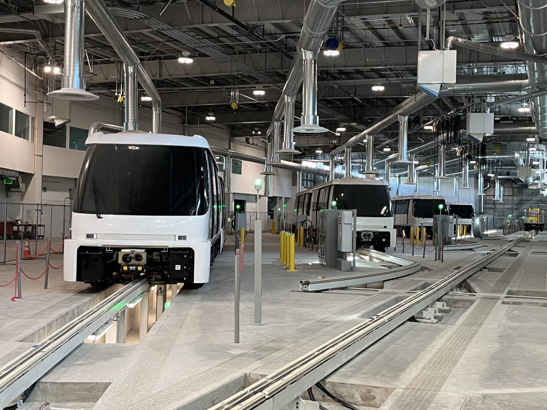 LAX’s train will operate 24/7, with trains arriving at stations every 2 minutes during peak hours (from 9 a.m. to 11 p.m.). Running on 2.25 miles of elevated guideway, it will connect to six stations: three inside the Central Terminal Area, one at LAX’s Economy Parking facility, one connecting to Metro’s LAX/Metro Transit Center station (with transfers to the C and K lines) and one at LAX’s Consolidated Rent-A-Car facility. Total end-to-end travel time will be 10 minutes with a top speed of 47 miles per hour.