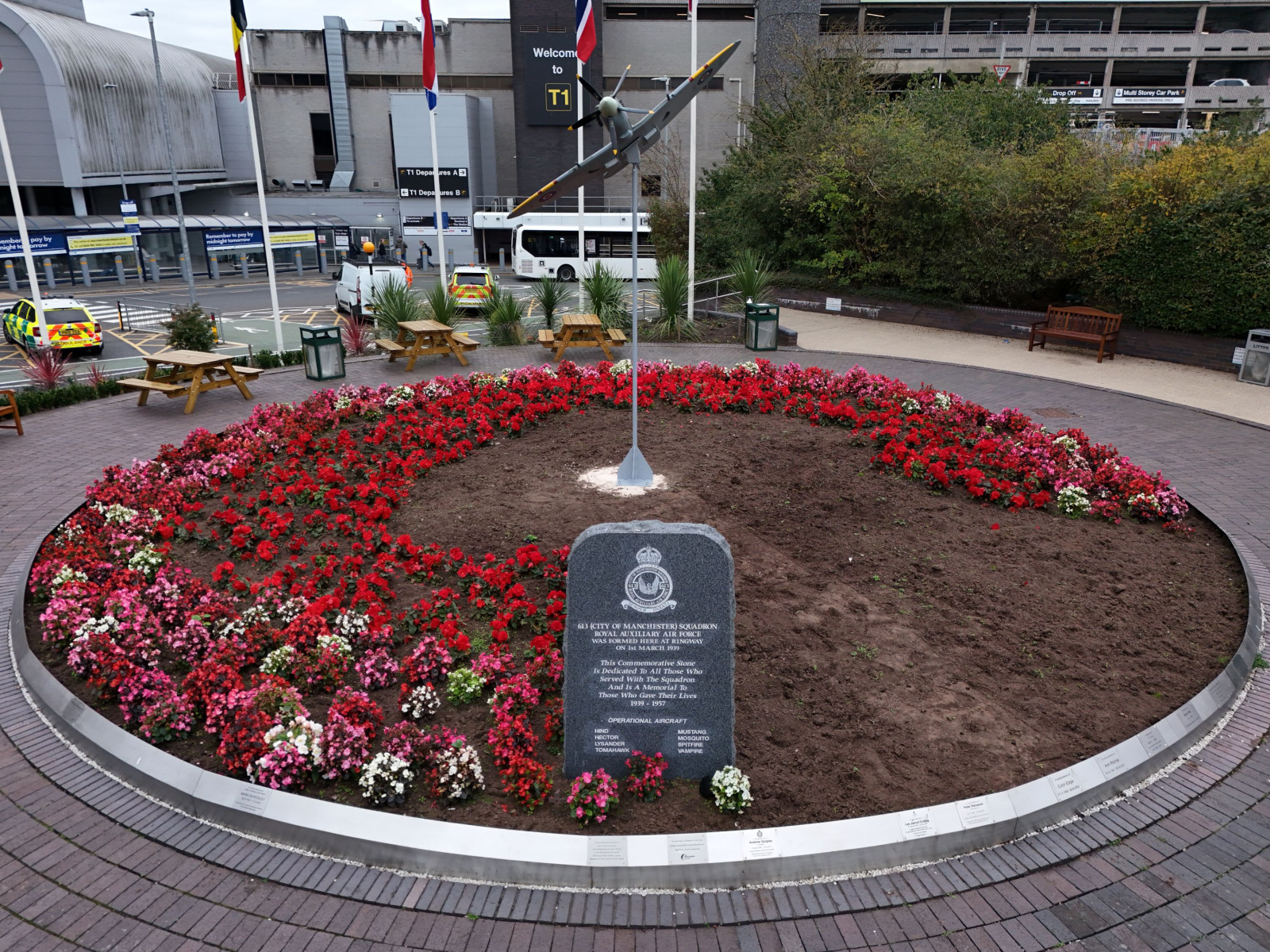 The memorial, which comprises a 1:4 scale Spitfire over a circular flowerbed filled with poppies, pays tribute to the 613 (City of Manchester) Squadron of the Royal Air Force, which was formed at RAF Ringway, the wartime name for Manchester Airport.