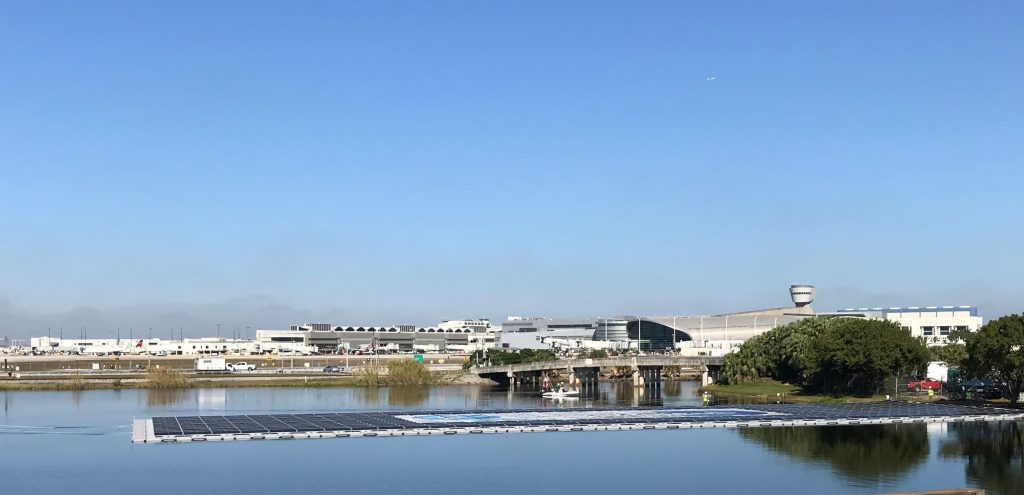 In January 2020, Florida Power & Light Company and Miami-Dade County launched a half-acre, 402-panel floating solar installation into the waters of the Blue Lagoon adjacent to the airport. The partnership between FPL and Miami-Dade County is the largest floating solar array in the southeastern U.S. and the first-ever at an airport. The solar array, which generates 160 kilowatts of power and prevents 165 tons of carbon dioxide emissions annually, is also a test-bed for cutting-edge research the performance of solar panels on water.