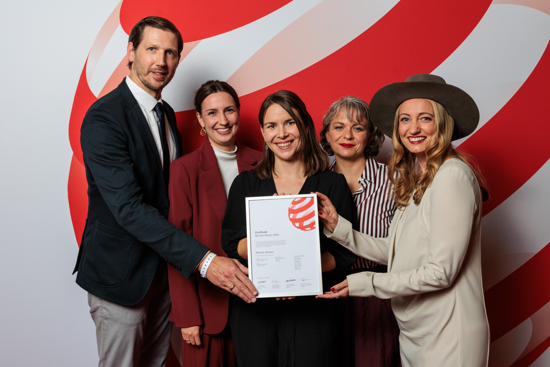In September 2025, the jury of the Red Dot Award, one of the world’s most prestigious seals of quality for design, honored the new design in the “Brands & Communication Design” category. Just four weeks later, this was followed by receiving the title of “Winner” in the category of “Excellent Communications Design – Corporate Identity” at the German Design Award. This award recognizes projects that promote innovation and offer new perspectives through their design. The German Design Award ceremony will take place in Frankfurt in February 2026. On November 7, the airport’s brand team celebrated receiving the Red Dot Award together with the responsible agency, Serviceplan Munich, in Berlin.