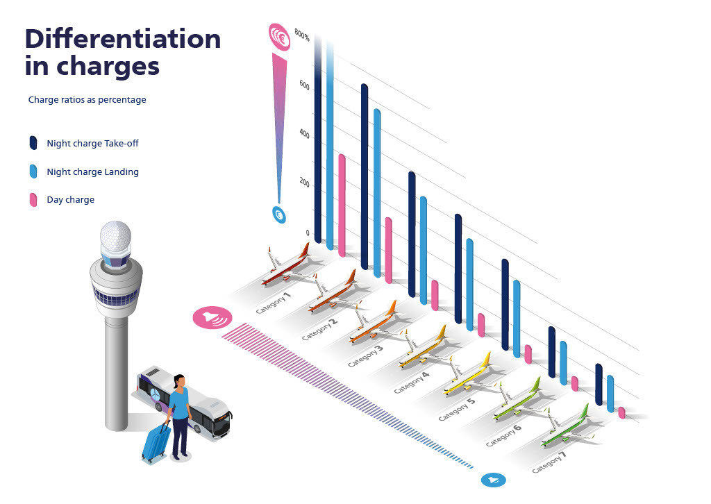 - In line with the ambition to reduce noise nuisance, Schiphol is using these charges to encourage airlines to use their quietest planes. The charges for quieter aircraft are going to be less expensive, while older, noisier planes are going to cost airlines more. Night flights will also be subjected to additional charges. There is a category of aircraft that make so much noise that they will be banned as of 2025. ‘