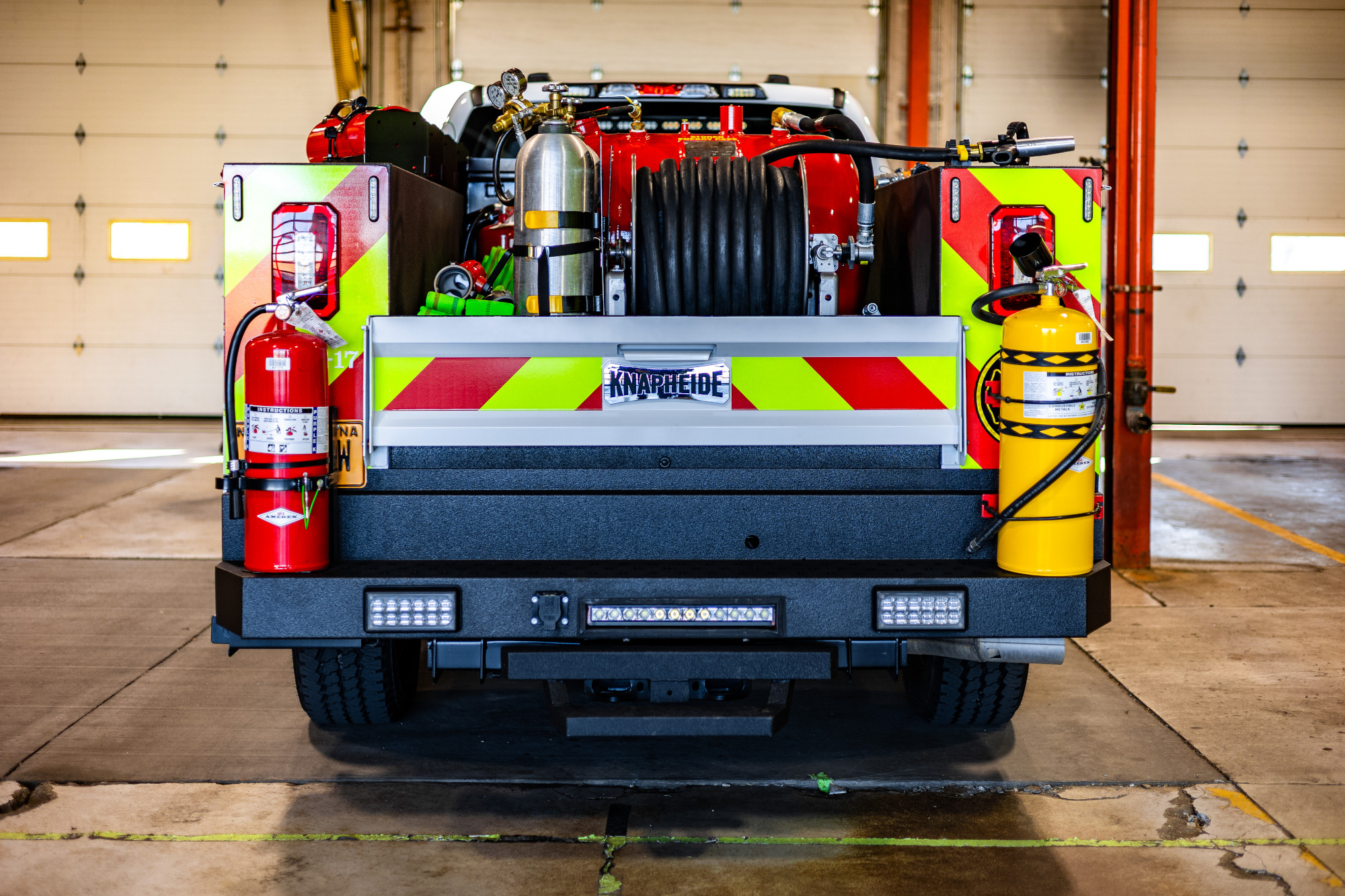 This F-350 can be operated by a single firefighter and has been custom retrofitted with a 60-gallon compressed-air foam system, eight car-fire blankets (each weighing 65 pounds), hose couplings and fittings, fire extinguishers, a specialized EV undercarriage nozzle and an EV-safe plug.