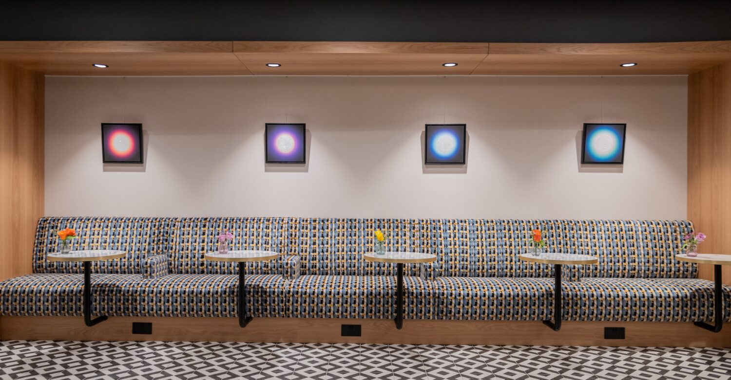 The beautifully designed 766 square metre lounge, with floor to ceiling runway views and a capacity of 147, offers a quiet zone for business travellers needing to focus. The lounge is designed with subtle nuances to the surrounding city of London. Elements include use of architecture in a simple and stylised way, as well as fun influences from the London Underground tube seat patterns in the furniture and tiles.