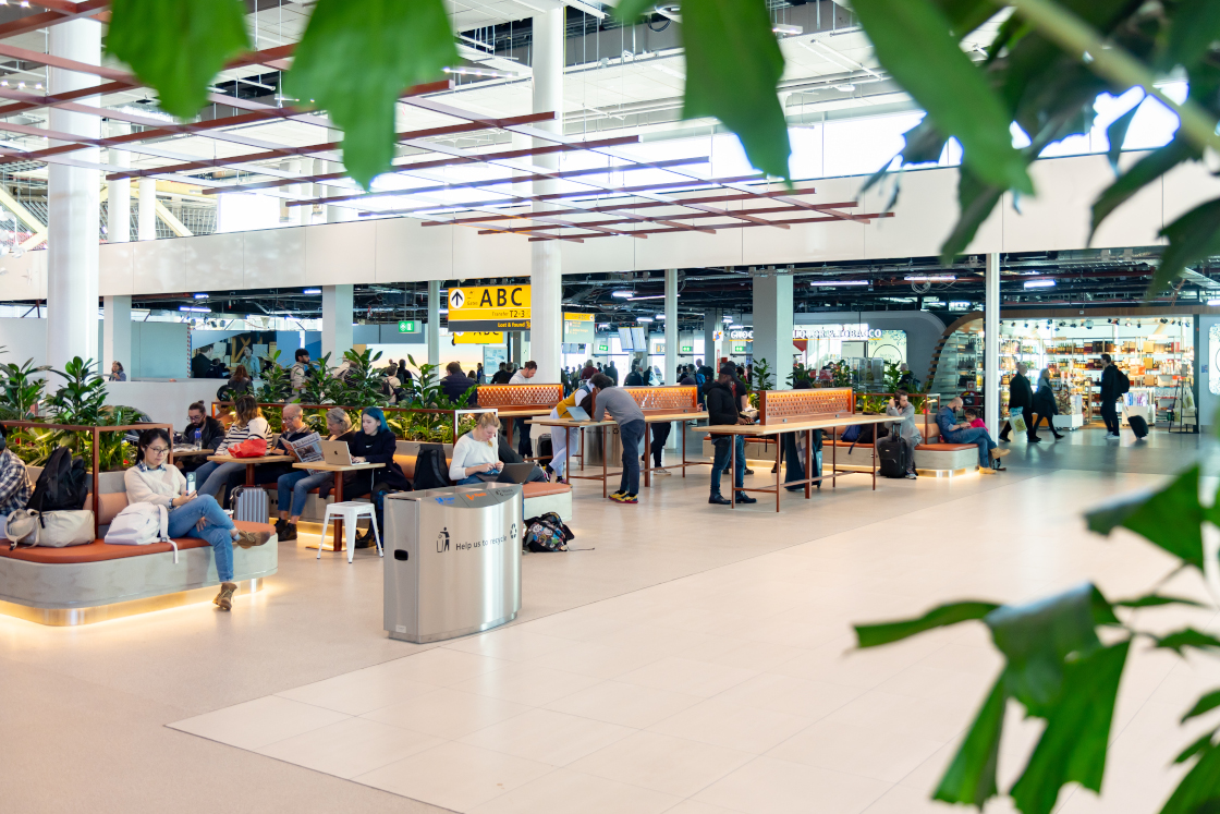 This additional space was created by transforming a car park and parts of four existing buildings into a new passenger area. Connecting the building parts together created a spacious plaza with lots of natural light. Three large trees of four to six metres provide a natural, calming atmosphere. For the interior, more sustainable materials such as bamboo wall panels were chosen, and grass cut at Schiphol was incorporated into the seating.