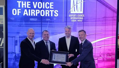 The accolade was received by Airport CEO Jost Lammers (left) and the Head of the AirportAcademy, Alexander Hömer (2nd from right), handed over by Luis Felipe de Oliveira (Director General of ACI World 2nd from left) and Olivier Jankovec (Director General ACI Europe; right) at the ACI Europe/World Annual General Assembly in Barcelona at the end of June.
