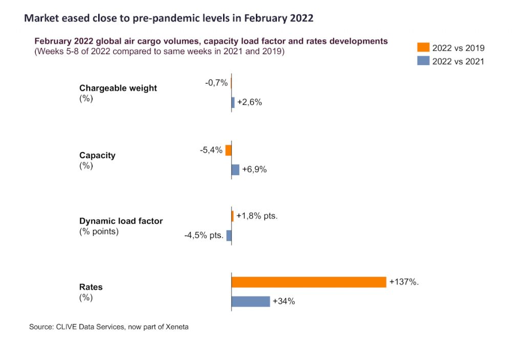 Chargeable weight in February was at -0.7% to the pre-Covid level in 2019, and +2.6% compared to February 2021, with capacity in the market standing at -5.4% and +6.9% to the respective 2019 and 2021 figures. CLIVE’s weekly and monthly analyses of the general air cargo market continues to measure performance to the pre-Covid 2019 level, as well as giving 2021 year-over-year comparisons, to provide a meaningful assessment of its current performance.