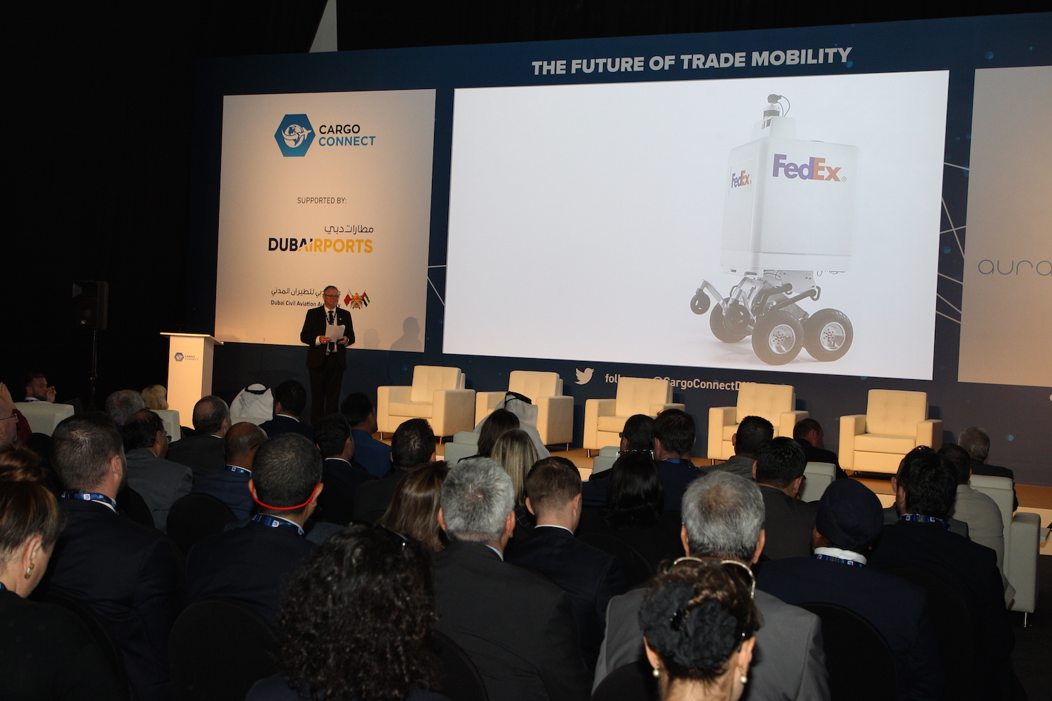 An autonomous delivery device known as Roxo, exhibited by headline sponsors FedEx Express, delighted delegates, gliding up on to the stage to bring notes to conference MC Kim Winter of Logistics Executive, and obeying voice commands from Jack Muhs, Regional President, FedEx Express MIESA.