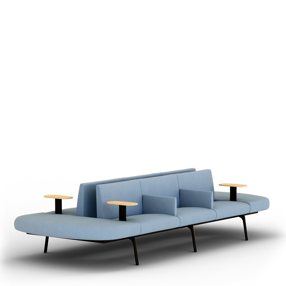 The seats are made of modular units of polyurethane foam for upholstery and can be purchased with or without a backrest. Additionally, the seats can have a closed corner at 90 degrees or an open and closed corner at 45 degrees. When placed in a double row, a sound-absorbing back panel can be added to provide the necessary privacy while sitting on the sofa.