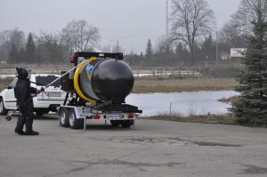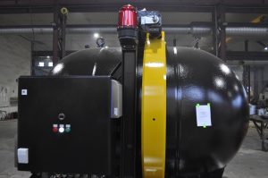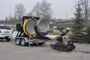 It allows multiple safe transport of suspected items beyond the area of people presence and sampling of post detonation gases in case of an explosion. The spherical body of the device has the volume of approximately 1,7 m³ and is made from steel.