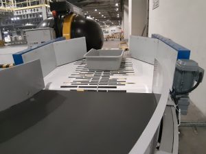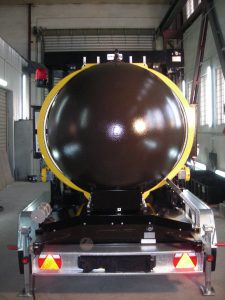 The container body is made from two parts connected together with closing ring. One part is fixed to the frame, while the second one is fitted on the rails which allow container opening and enable access to the transport shelf. Closing of the container is sealed with gaskets made of a rubber resistant to high temperature.