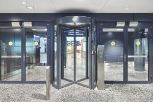 Geryon security revolving doors secure protected areas of a building against unauthorised entry and offer a variety of options for different levels of security. Scales or a separation sensor can also be used to monitor the interior of the unit for individual access. They can be controlled by a card reader, buttons, control desk or even by biometric identification systems. The wide and varied selection of optional extras includes reinforced bullet-proof and burglar resistant versions.