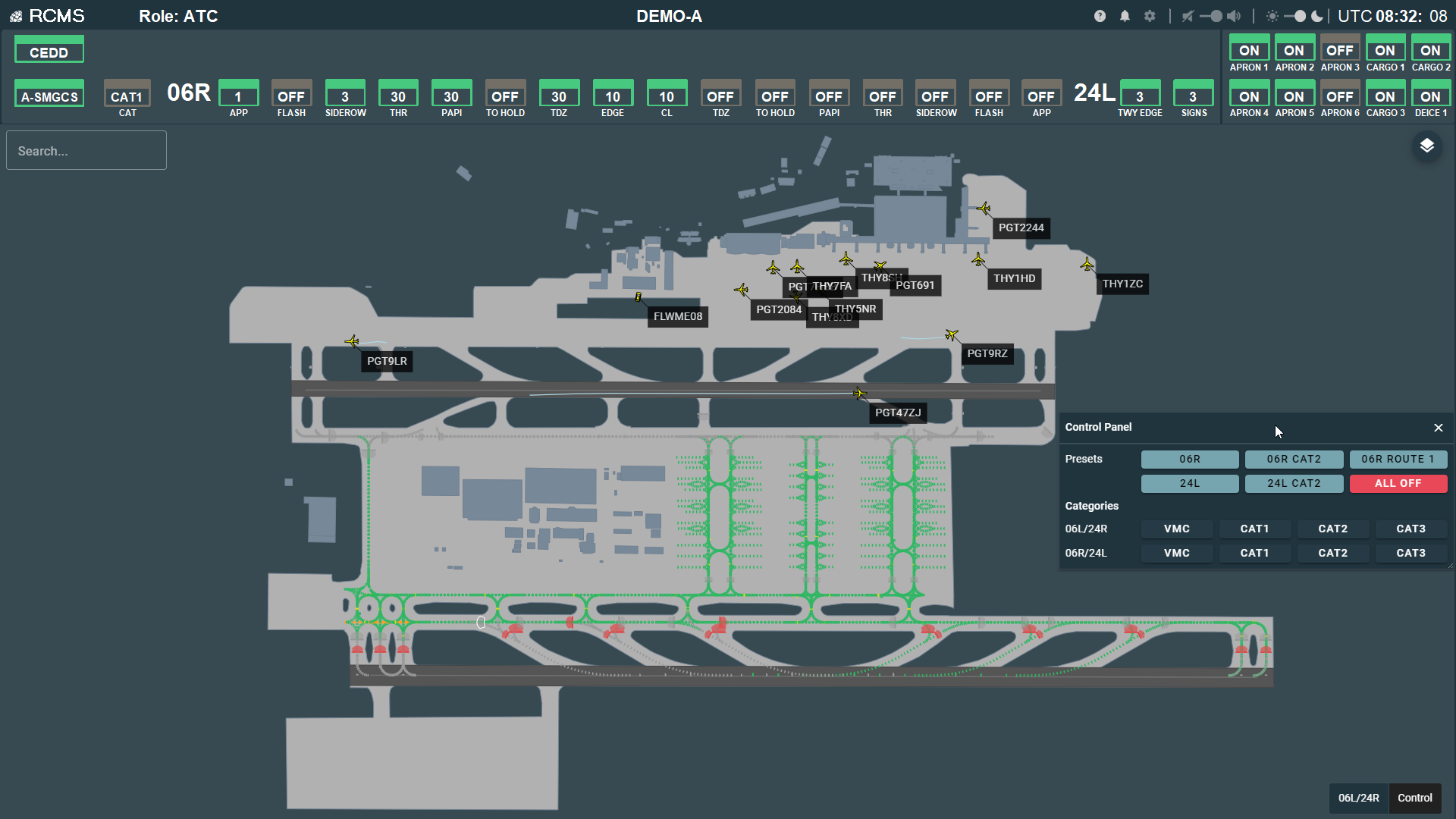 All functionalities are controlled, and real-time status is displayed on the geographical map which gives the air traffic controller a complete overview.