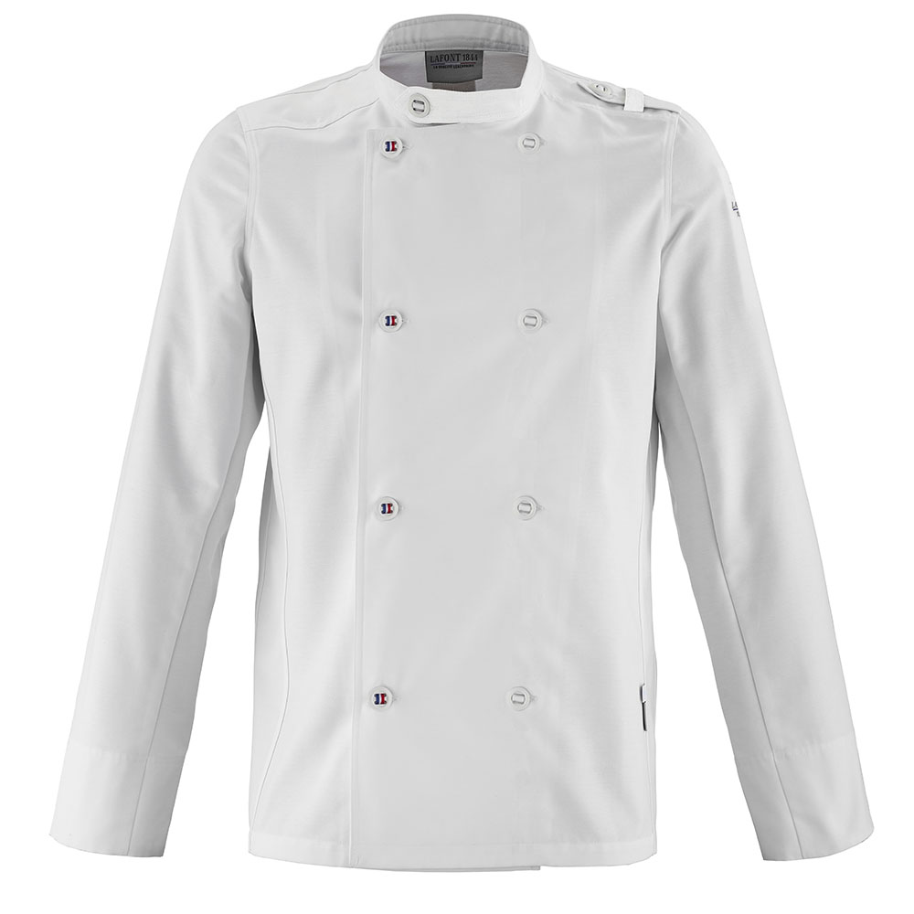 Kitchen jacket style “MILITARY”. Button-down officer collar. Crossed breastplate closure with bridge buttons. Blue/white/red braid on front bib on the left side. Slit wrists. Buttoned left shoulder tab with removable and customizable loop. Embroidery in recycled polyester thread tone on tone recycling symbol on the bottom right sleeve. Embroidery in recycled polyester thread LAFONT 1844 under the left sleeve pen pocket. Claw 37.5 on the side. Finished with an offset arm. Organic resin buttons with recycled polyester loops. Rounded back seam. Centre back flat pleats for a comfortable fit Wide turn-up with vent. Left or right button front. Flag label.