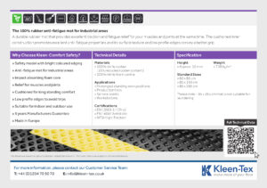 Ideal for standing areas, workstations, packing lines, and security posts, the Kleen-Comfort Safety Mat provides long-standing comfort, durability, and protection — a trusted choice for industrial and commercial workplaces where comfort and safety are paramount.