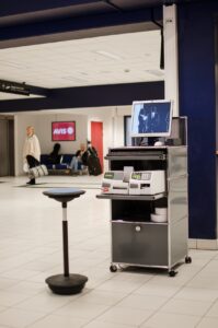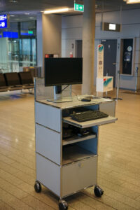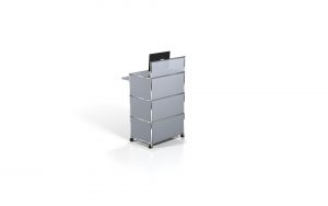 The USM modular mobile check-in desk is often combined with stationary units in situations of increased passenger numbers. It includes a height adjustable keyboard shelf, printer extension shelves and a lockable door for the CPU. It is often used in combination with self-check-in stations. The casters are available in hard or soft versions with optional locks. Double casters are available for increased durability.