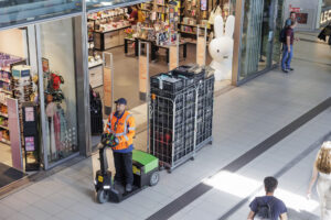 The RR1000-S combines comfort and maneuverability with a strong focus on safety and a towing capacity of 1,000 kg, making it well suited for longer distances and intensive use in airport environments. It features an exchangeable battery system, two speeds, an adjustable ergonomic tiller head and backrest, horn, audio signal while driving, strobe light, video camera and a safety detection mat. Thanks to the coupling system, almost any type of rolling equipment can be easily moved, including luggage and food & beverage carts, waste and recycling containers, cleaning carts, and other shop supply carts/ roll containers.