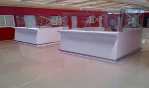 The CURVED counter range developed by INTOS comprises an inviting vacuum-formed Solid Surface front panel, available in various colors and patterns. The combination of the Solid Surface front panel, compact laminate desk top, sides and printer cabinet, stainless steel plinth and foot rail makes the CURVED a solid, state of the art counter range. The CURVED counter range is available in different counter types for check-in, passport control/immigration, boarding gate, ticket sales, car rental, etc.. This ensures a consistent look & feel throughout the complete terminal.