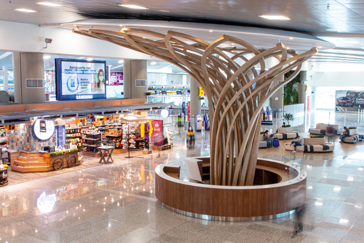 One of the main elements of the remodeling was the creation and construction of a sculptural element in the center of the public departures hall. It is a latticework of wooden pieces that start from a central point that opens in all directions. The use of wood gives it a unique warmth and versatility that could not have been achieved with any other material. The piece has a height of 7.2 meters and is constructed with local balsa wood from sustainable forests.