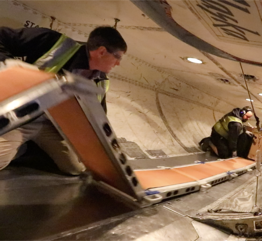 TISABAS works seamlessly with existing airline equipment and the process for unloading and loading narrow bodied aircraft. TISABAS is separate from but secured on a belt loader and is moved into the belly after the belt loader is safely positioned at the aircraft. The sections are folded out as unloading goes further back into the belly. When each section goes flat the belts are engaged. Once the aircraft is offloaded, TISABAS is positioned for the on-load. As the belly hold fills, the sections are folded up accordion style and the belting stops as the folding begins. With the hold full and TISABAS back in its original rectangular shape, it is moved back onto the belt loader.