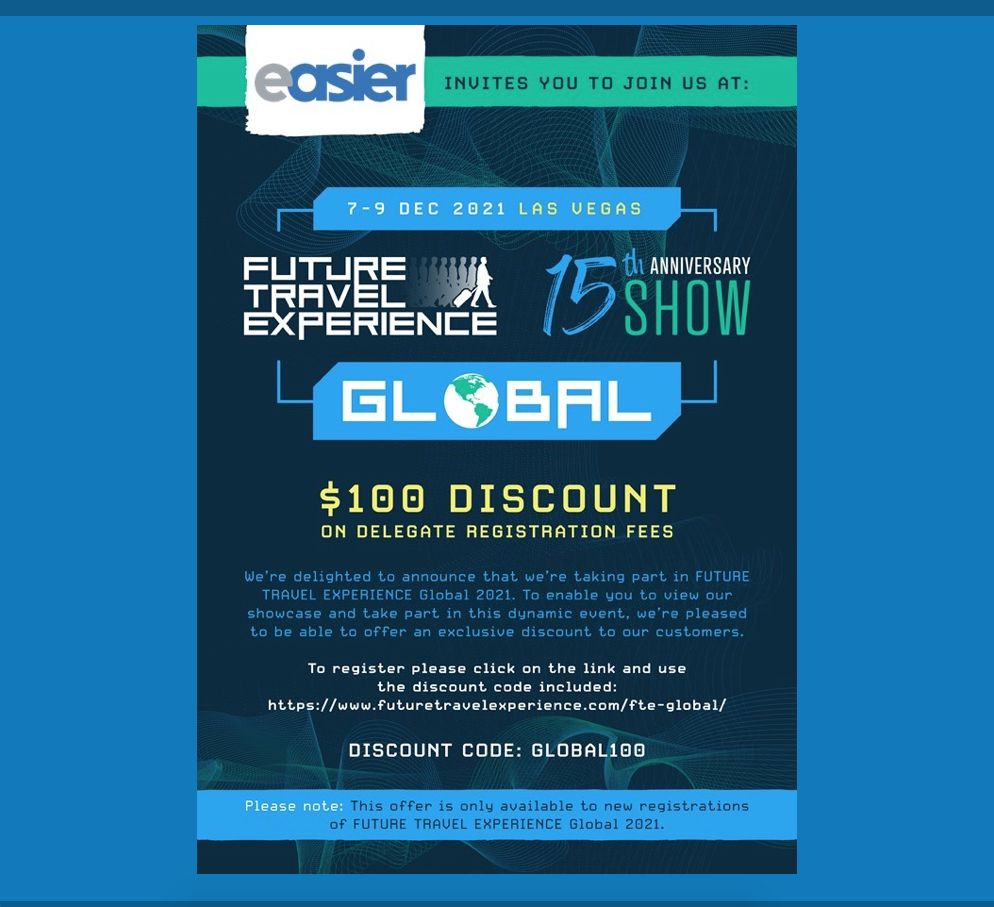 We’re delighted to announce that we’re taking part in FUTURE TRAVEL EXPERIENCE Global 2021. To enable you to view our showcase and take part in this dynamic event, we’re pleased to be able to offer an exclusive discount to our customers.