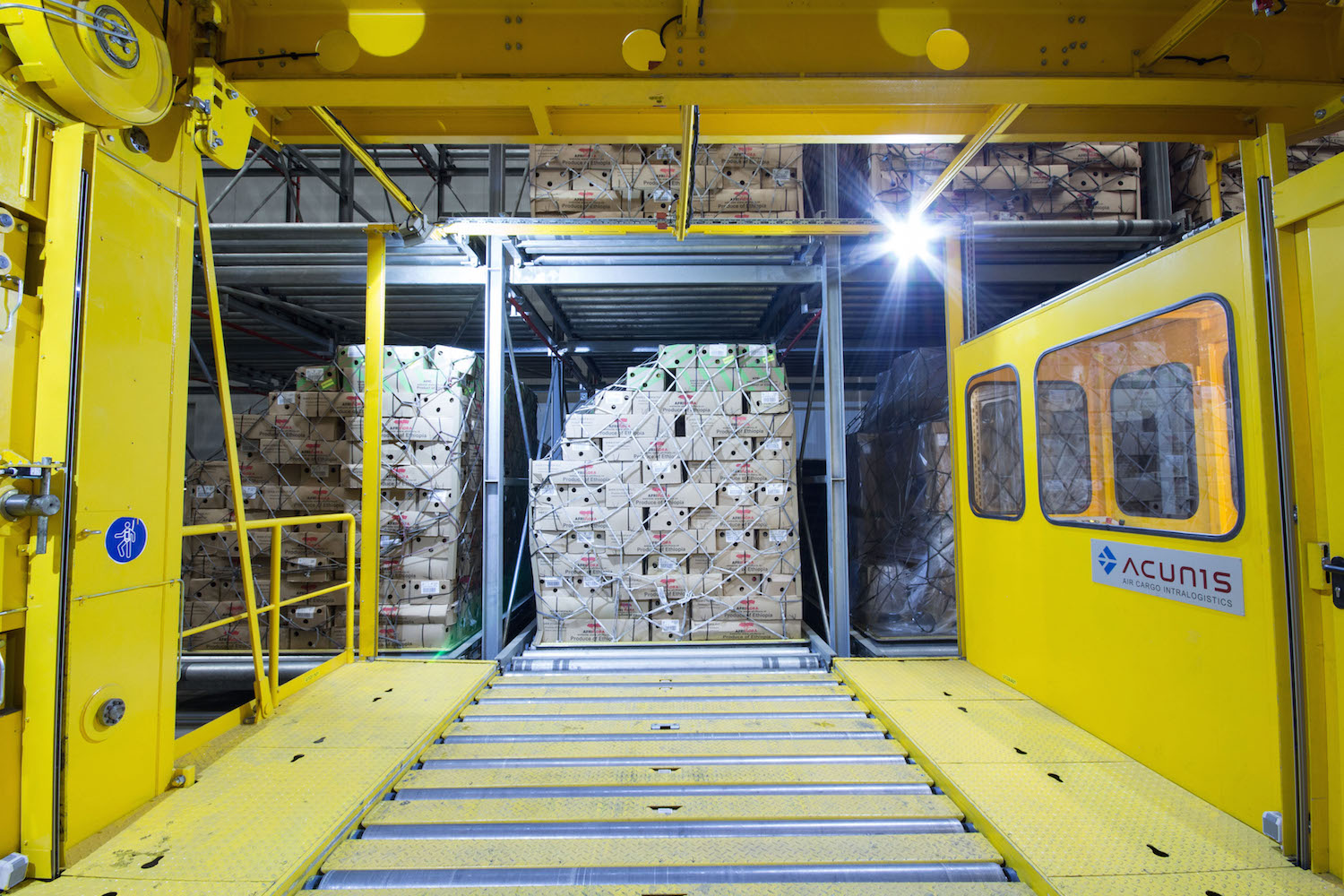 Export and import orders as well as transit processes are handled through the new facility in which the terminal serves as a transshipment point. The freight center is divided into a spacious refrigeration zone (17,000 m²) with temperature ranges from 2 to 10 degrees Celsius and a non-refrigerated dry zone (19,000 m²). The computer-controlled installation has capacity for 600,000 tons of freight per year. The hearts of the terminal are two automatic warehouses for air cargo containers (unit load devices, ULDs). Containers of various sizes can be combined in the 20 feet compartments, so that up to 1,000 10 ft ULDs can be stored simultaneously. Four fully automatic elevating transfer vehicles (ETV) are used to handle the heavy aluminium containers weighing up to 6.8 tons. The demands on the process chain are especially high to ensure optimum throughput. Once a cargo plane lands, it must be unloaded as rapidly as possible and loaded with new freight. Maintaining the cold chain for fresh products also has top priority.