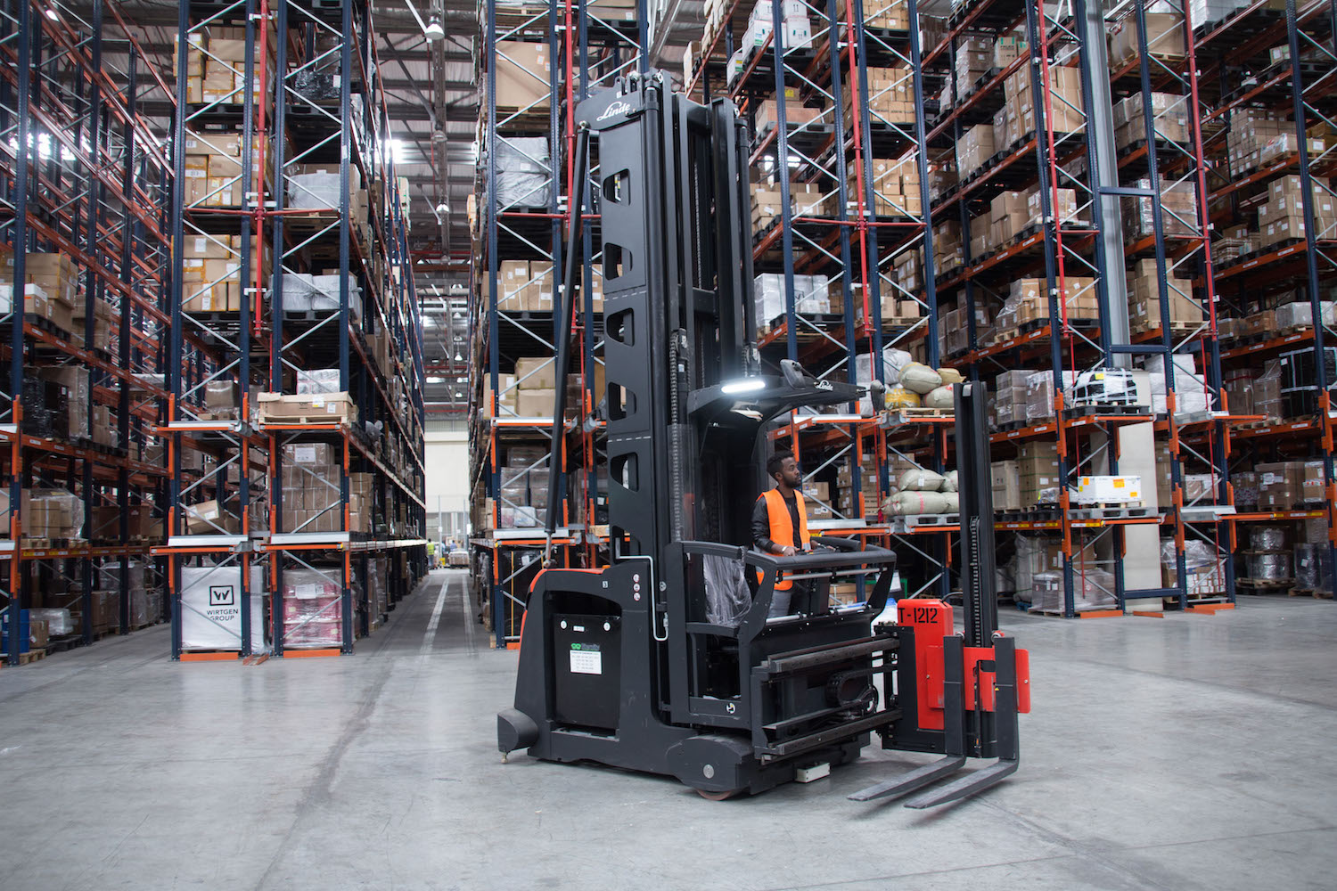 The shipment pallets are temporarily stored in a ten-aisle pallet warehouse by narrow-aisle trucks.