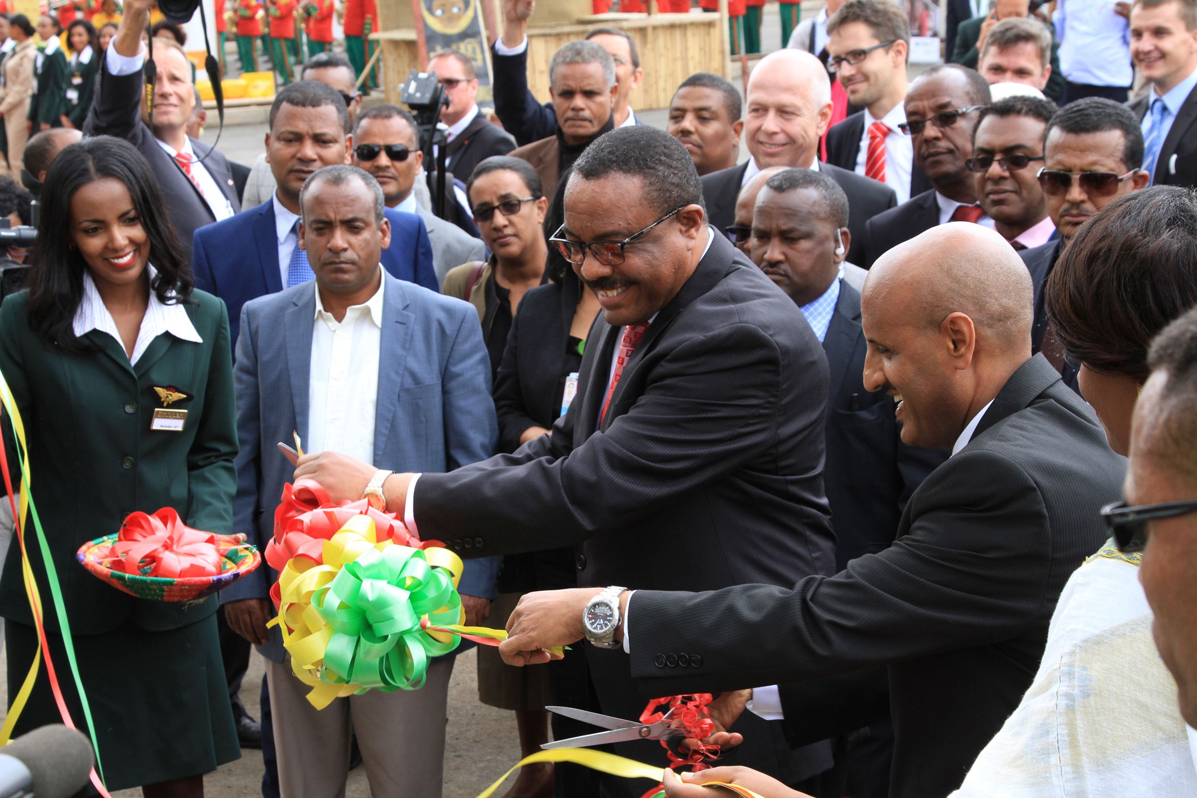 Cutting the ceremonial ribbon together: Ethiopia’s Prime Minister Hailemariam Desalegn (l) and Tewolde Gebremariam, CEO of Ethiopian Airlines (r).