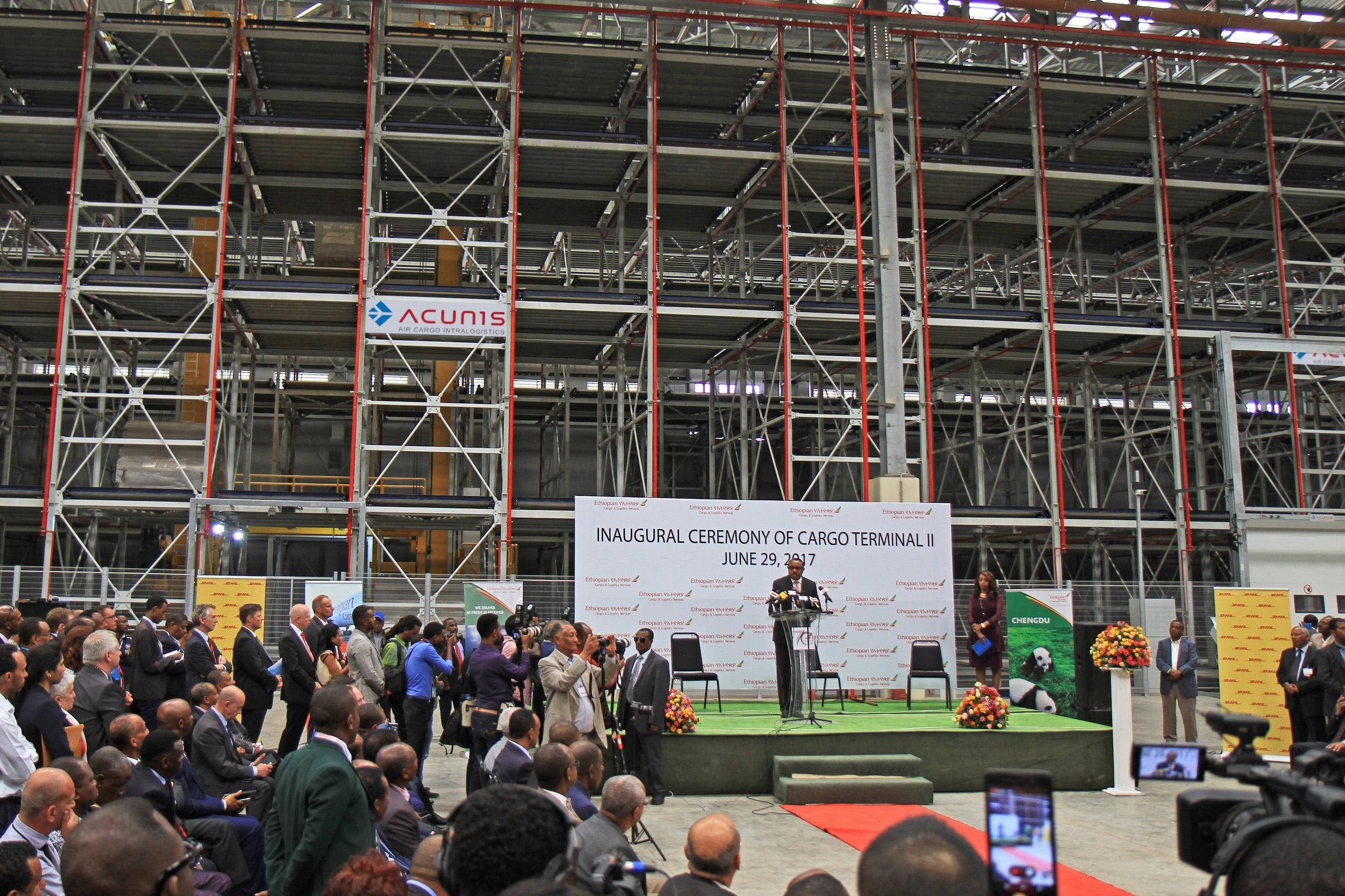 Ethiopian Airlines celebrated the opening of their new air cargo terminal at the Addis Ababa airport in Ethiopia on June 29, 2017. The facility was realized by ACUNIS, a joint venture of AMOVA and Unitechnik specializing in air cargo intralogistics. The new facility is the largest of its kind on the entire African continent. Ethiopian Airlines will transship around 600,000 t of goods per year from this terminal in future. Around 600 invited guests from the world of politics and business and the air cargo industry took part in the opening ceremony. Among the first well-wishers was also Ethiopian Prime Minister Hailemariam Desalegn.