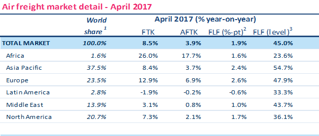 All regions, with the exception of Latin America, reported year-on-year increases in demand in April 2017. Airlines in Europe and Asia-Pacific accounted for more than 70% of the annual increase in global freight volumes. North American airlines accounted for much of the rest with Middle Eastern and African airlines also making a positive contribution.