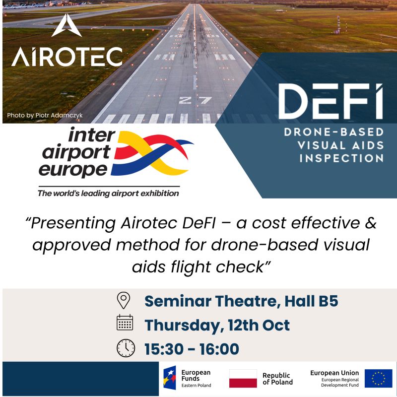 Presenting Airotec DeFI (Drone-Based Visual Aids Inspection) a cost effective and approved method for drone-based visual aids flight check. A presentation by Adam Rytter at Inter Airport Europe on Thursday, 12th October in the Seminar Theatre, Hall B5, 15.30 – 16.00.