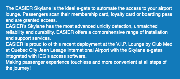 The EASIER Skylane is the ideal e-gate to automate the access to your airport lounge. Passengers scan their membership card, loyalty card or boarding pass and are granted access.EASIER’s Skylane has the most advanced unicity detection, unmatched reliability and durability.