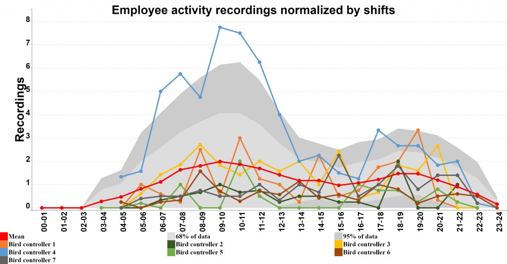 We normalised the data by looking at the numbers of bird recordings, no activity recordings and bird controller movements (measured as device position in 25-meter intervals) in hourly intervals, divided by the number of shifts. A shift is defined as the number of different days when recordings have occurred in the given time interval. The average is calculated as a smoothed average by including the hour before and after to avoid spikes in the data.