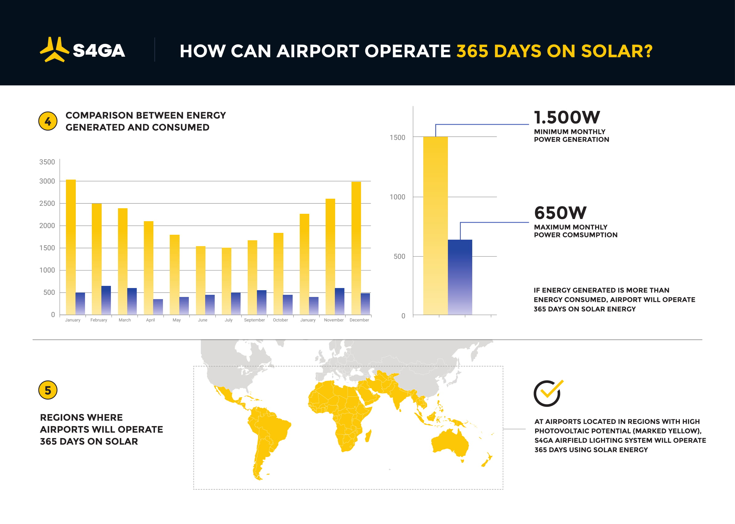 S4GA engineers have calculated very carefully all the phenomena and factors resulting in design of a source of energy that guarantees sufficient power to supply permanent runway lighting to airports not only situated at low latitudes, but also at the higher ones where the sun is relatively low above the horizon and often does not appear from behind the clouds for many days. The point is that an airport equipped with solar runway system, without any additional auxiliary power source, can operate 365 days a year reliably and safely. In this particular case, the aviation redundancy principle is especially redundant.