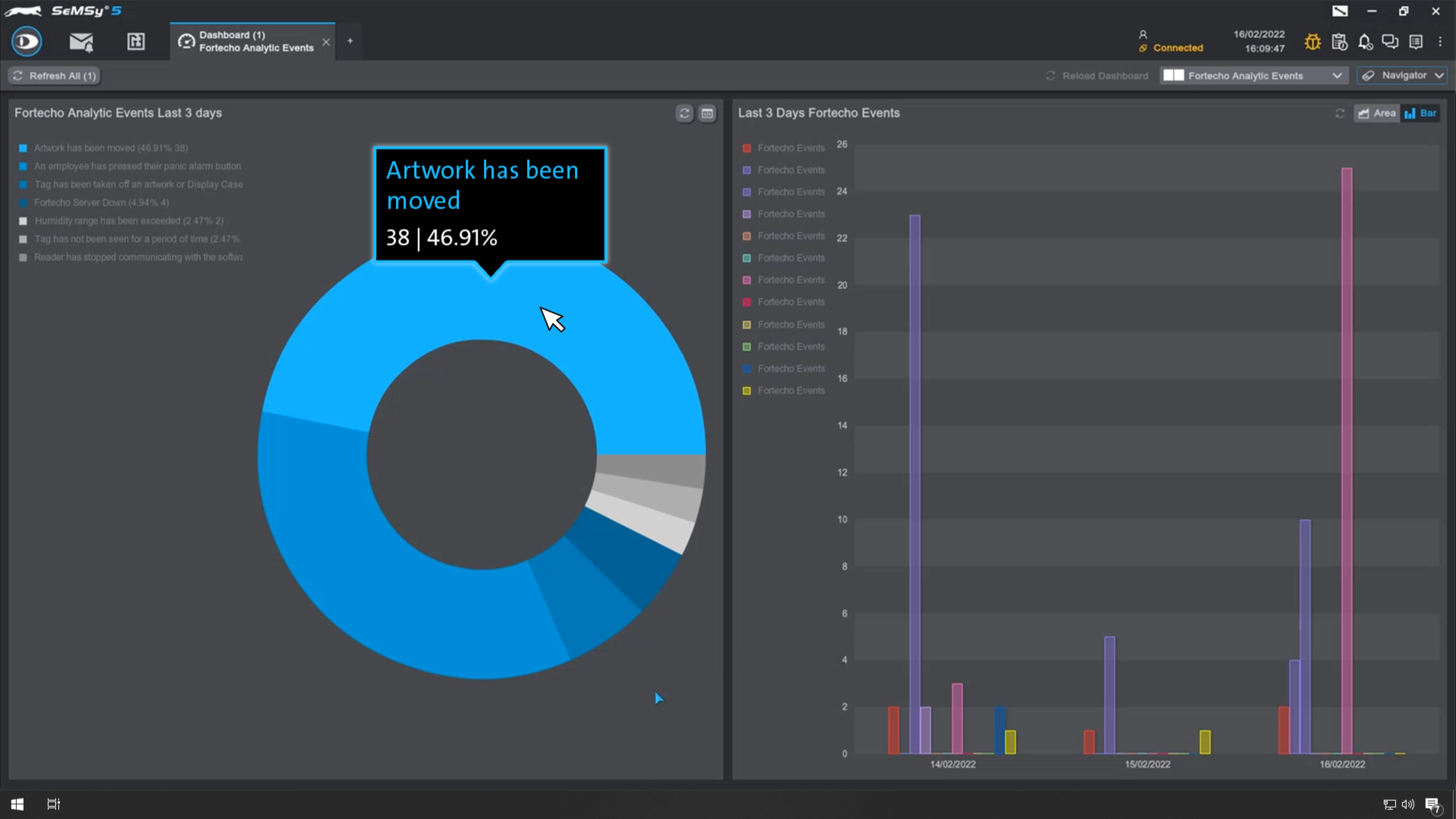 Fortecho’s own suite of powerful active RFID tags gather data at object level and transmit this via encrypted RFID signal to Fortecho’s bespoke enterprise software Aspect Arts®. Based on predefined rules and custom set parameters, the software evaluates the information and, if appropriate, triggers alarms. Movement, tamper, proximity, attack, temperature, relative humidity, and lux all present as unique customisable alerts in Fortecho’s enterprise software.
