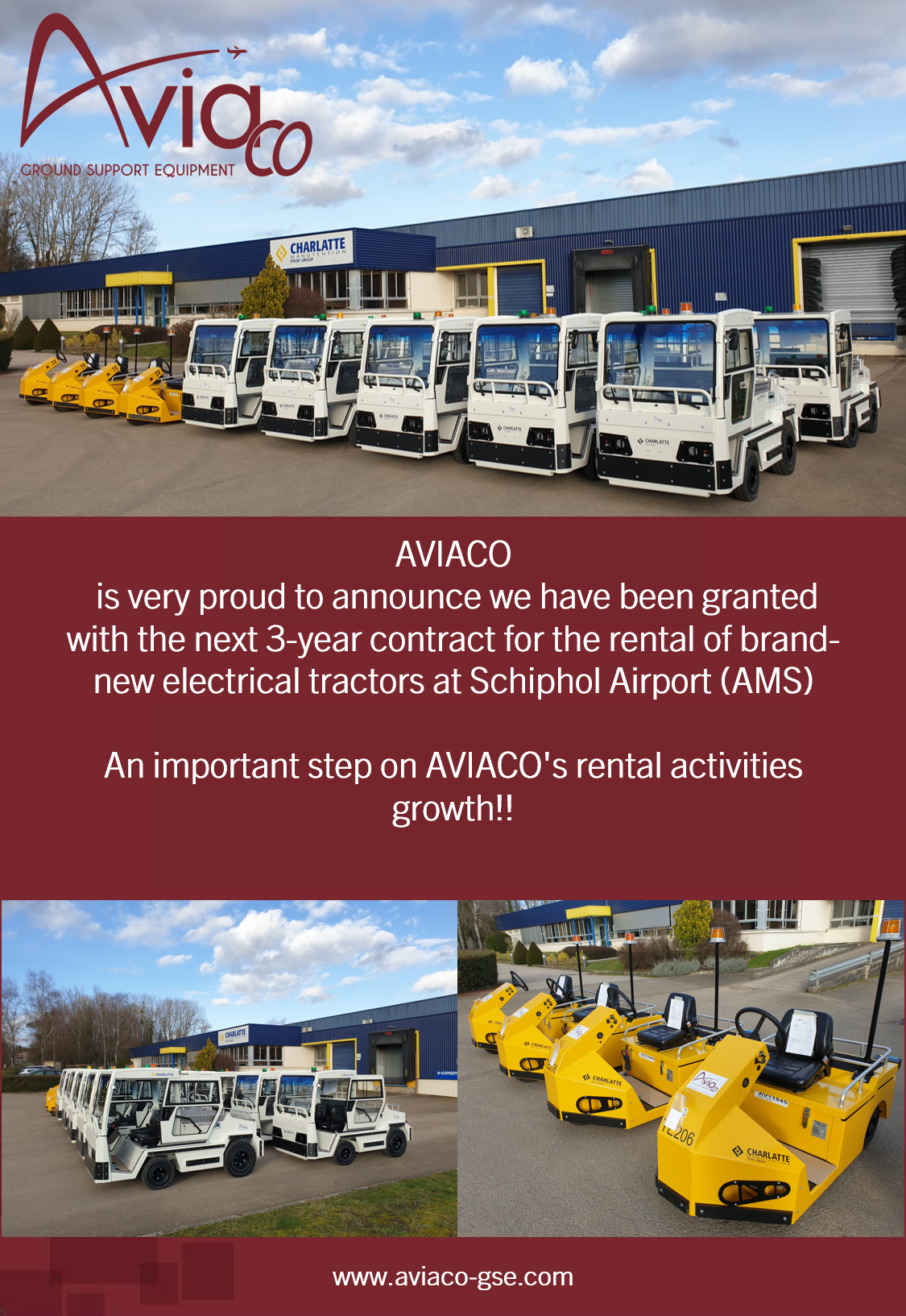 AVIACO is very proud to announce we have been granted with the next 3-year contract for the rental of brand-new electrical tractors at Schiphol Airport (AMS)