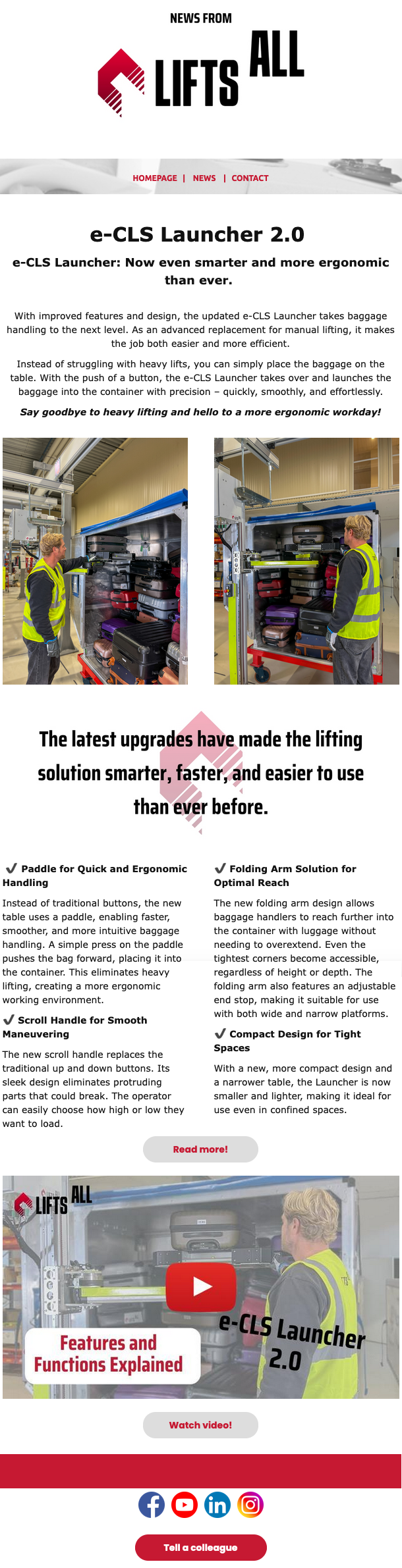 e-CLS Launcher: Now even smarter and more ergonomic than ever. With improved features and design, the updated e-CLS Launcher takes baggage handling to the next level. As an advanced replacement for manual lifting, it makes the job both easier and more efficient.