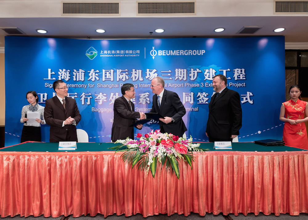 BEUMER Group – a leading global supplier of automated baggage handling systems – has attended a ceremony to mark the signing of a contract with Shanghai Pudong International Airport. The contract is for the Baggage Handling System (BHS) in the new Satellite Terminal which is scheduled for completion in 2019. The Satellite Terminal is the first to be built in China and the largest detached terminal in the world, with 83 departure gates and covering a total of 620,000 square meters.