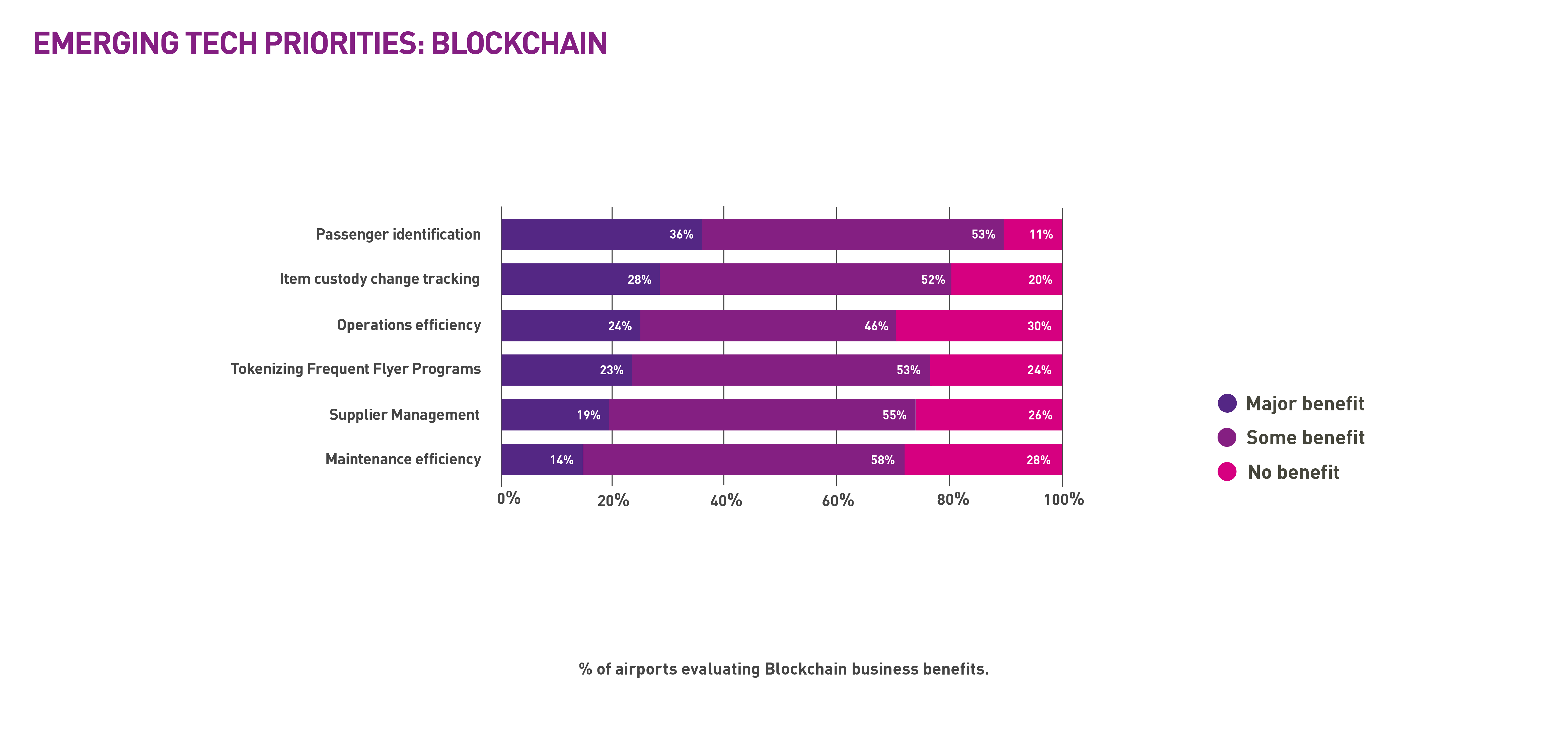 Today, 59% of airlines have pilot or research programs planned around blockchain for implementation by 2021, which is up from 42% last year. Similarly, airports also continue to experiment with blockchain with 34% planning R&D projects by 2021. The most commonly expected use of blockchain for both airlines and airports is to streamline the passenger identification process with 40% of airlines and 36% of airports saying this would be a major benefit.
