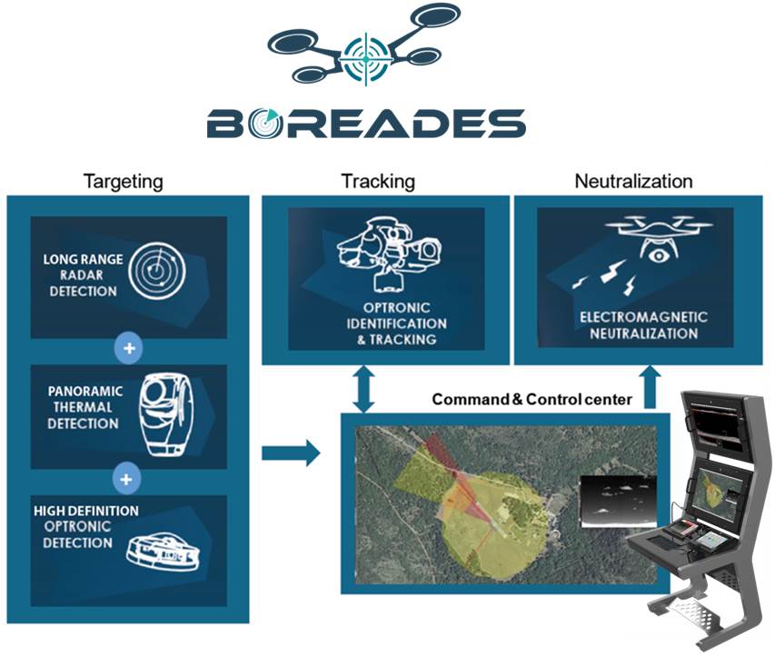 BOREADES is a high-performance scalable multi-sensor and multi-effector system, mainly based on civilian technologies with a very low Total Cost of Ownership. BOREADES is built around a ruggedized console and has 3 core functions: