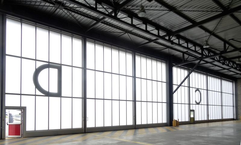 The fibreglass door filling in the colour Brilliant allows natural daylight to be spread softly and glarefree into the interior of the room, whereby the entire hangar surface can passively be used as an illuminating surface. This creates optimal working conditions in the hangar.