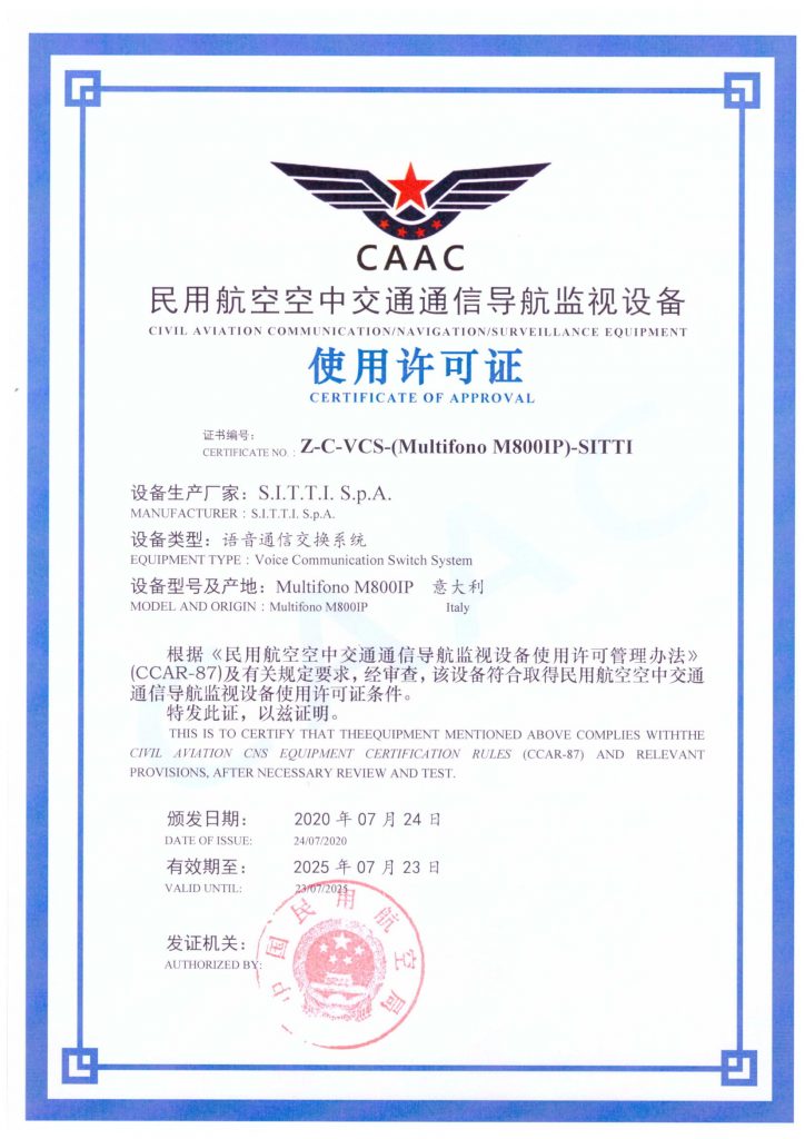 SITTI is proud to announce that on July 24th, 2020, it received the CERTIFICATE OF APPROVAL for its MULTIFONO® M800IP® voice communication system from CAAC, the Civil Aviation Administration of China. The certificate states that the system “complies with the civil aviation CNS equipment certification rules (CCAR-87) and relevant provisions”.