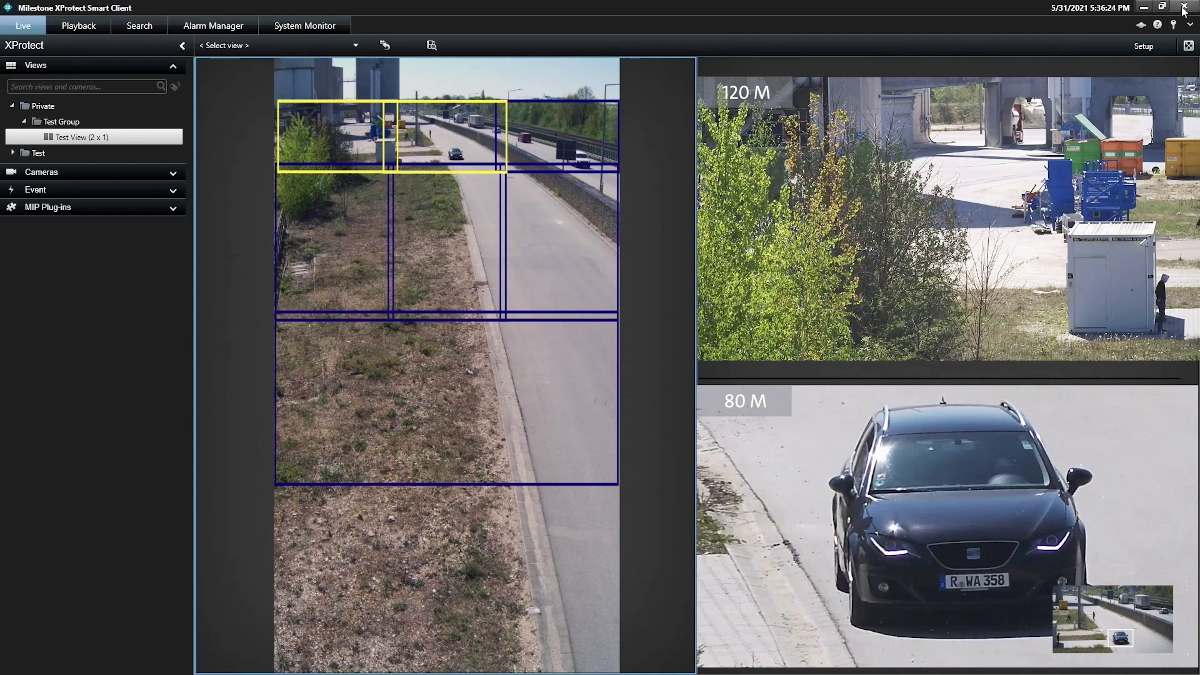 With the patented Panomera® cameras, the images from up to seven detail sensors and one overview sensor are intelligently combined in a camera system to form a high-resolution overall image of the object space. This eliminates the need for time-consuming and confusing switching between camera perspectives and unnecessary searches on building and environment maps. The number of cameras required as well as the number of screens to be observed is reduced many times over. XProtect® operators can now open and arrange all “submodules” as often as they like via the user interface and zoom in on any number of areas within the submodules at the same time. At the same time, the high-resolution display of the overall scene is always maintained. The benefit corresponds to the combination of a powerful megapixel camera with any number of high-resolution “virtual” PTZs.
